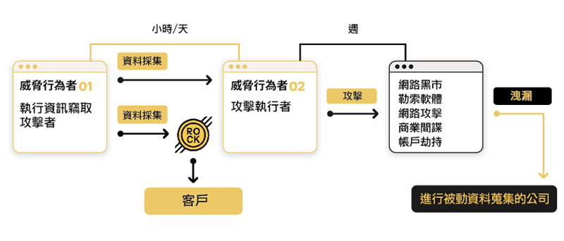 第二類威脅行為者在攻擊過後,會在網路犯罪論壇或 Telegram 免費提供這些資料。此時,其他網路安全公司也會開始收集這些資料,但資訊早已過時。